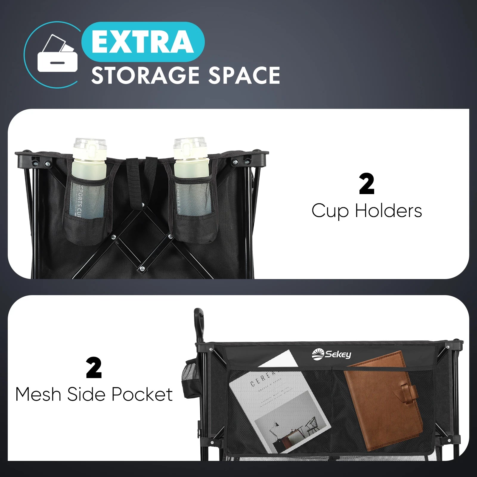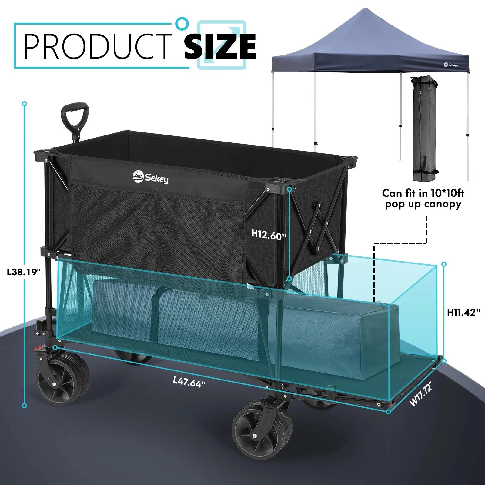 - 【5x STORAGE SPACE】Upgrade 50" long extended lower shelf for longer items, perfect for larger stuff like a 10*10 FT Canopy. The double-decker design provides over 5X the storage space of regular wagons, with an impressive loading capacity. Even more, the Sekey wagon comes with side storage and 2 cup holders.